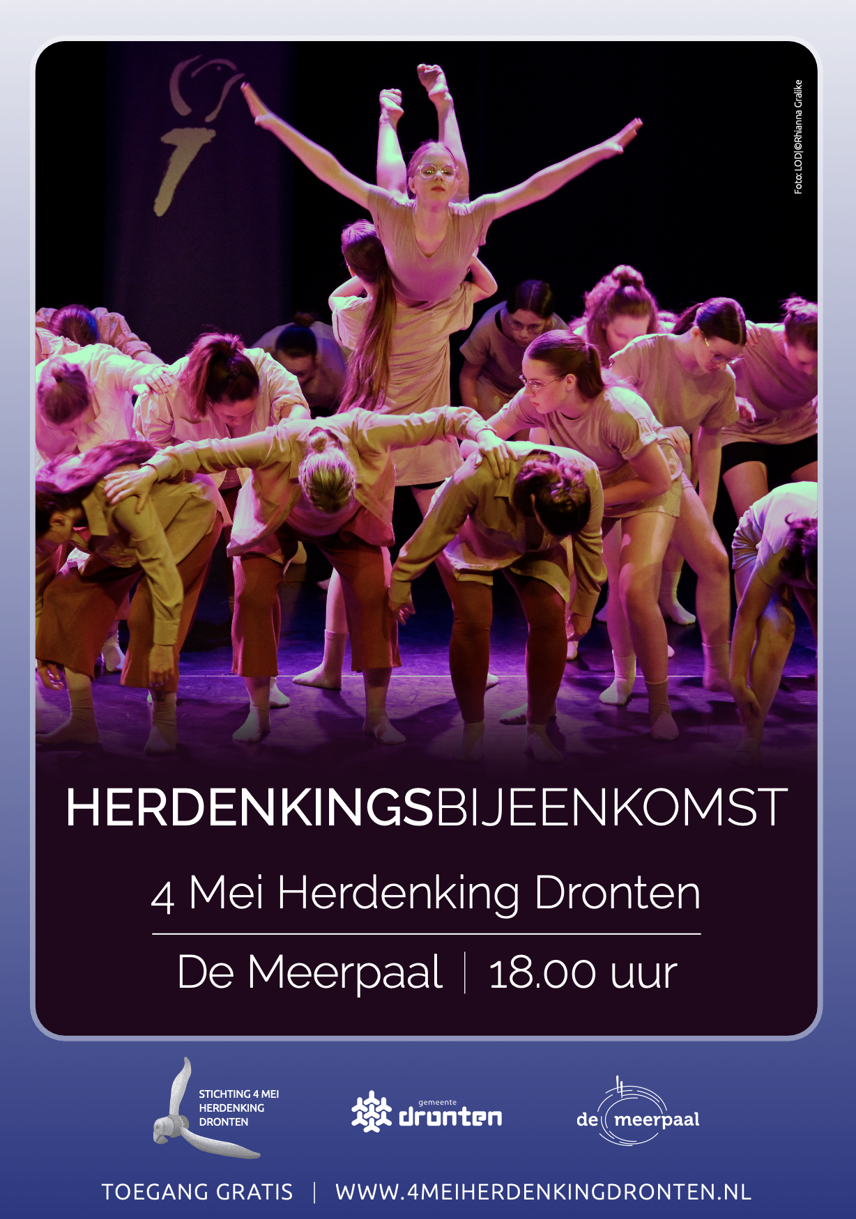 Op 4 mei 2026 vindt in De Meerpaal een herdenkingsbijeenkomst plaats voorafgaand aan de ceremonie op het plein. De bijeenkomst start om 18.00 uur in de Grote Zaal en is vrij toegankelijk voor iedereen. Het landelijke thema van 4 en 5 mei, “De geschiedenis leren begrijpen”, staat centraal. We geven op een betekenisvolle en afwisselende manier invulling aan dit thema. Er zijn bijdragen van Stefan van der Leeden (leraar geschiedenis Almere College Dronten), René de Graaf (veteraan), Gert Talens (verhalen vertaler) en Anouk den Bakker (leraar basisschool De Flevosprong). Zij gaan in op hoe in deze tijd de geschiedenis nog zichtbaar is en waarom dit belangrijk is. Het programma wordt ondersteund door een dansvoorstelling van de Dansschool van De Meerpaal, muzikale bijdragen van Theaterschool KARAKTER en de ‘Soul society’. De bijeenkomst wordt begeleid door Marleen Vos. Gratis kaarten zijn verkrijgbaar bij De Meerpaal