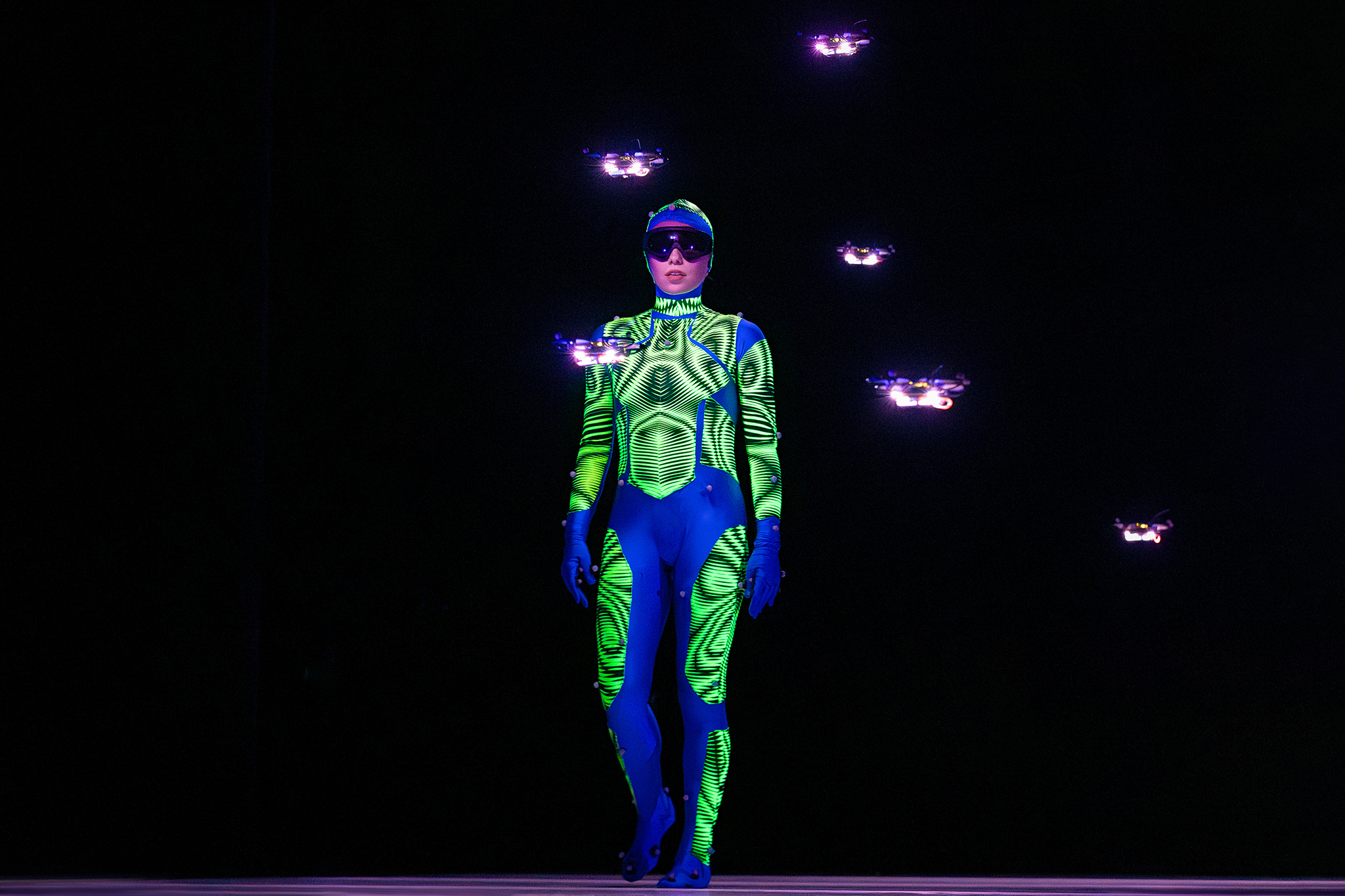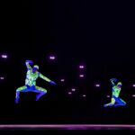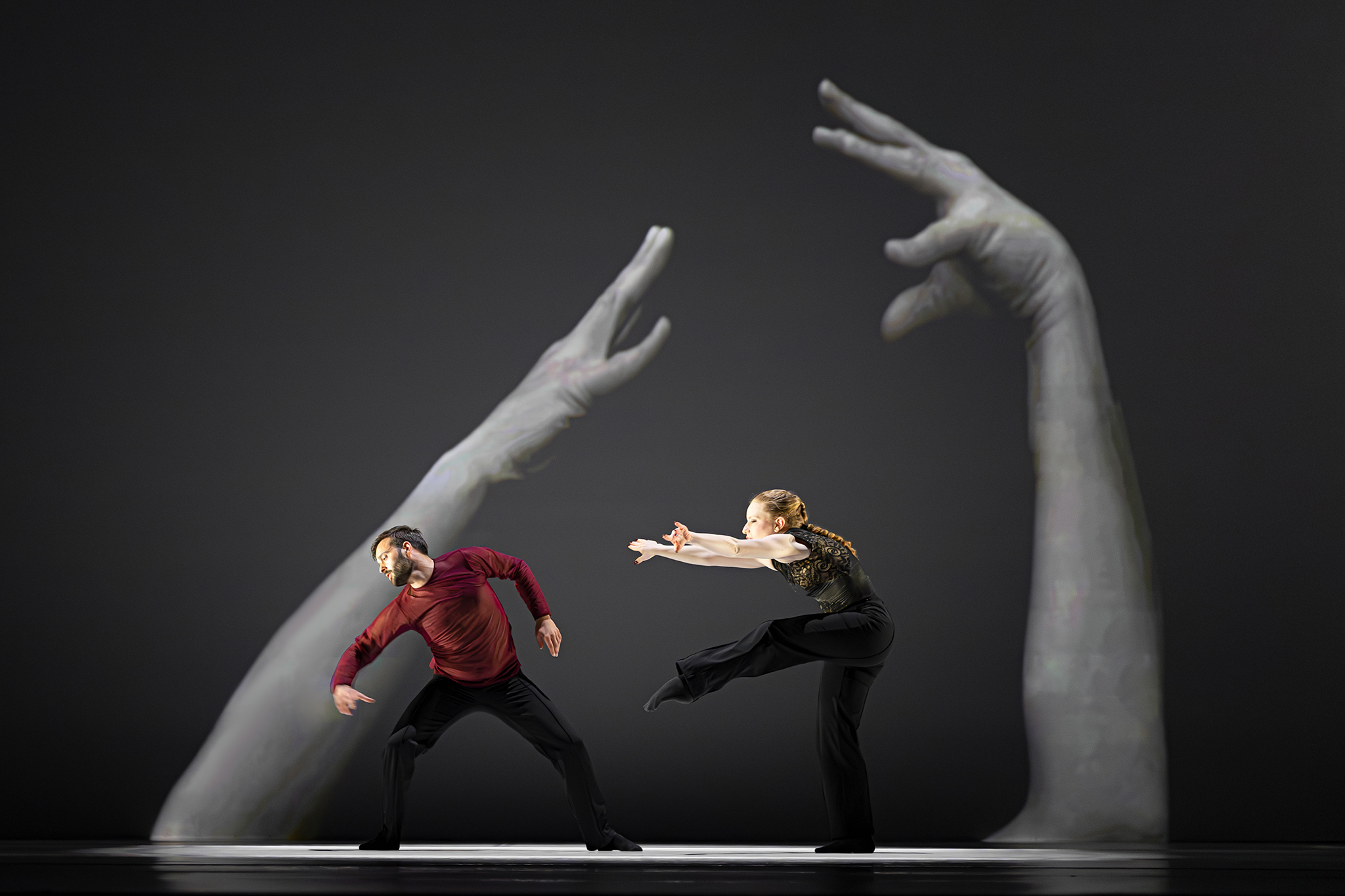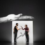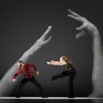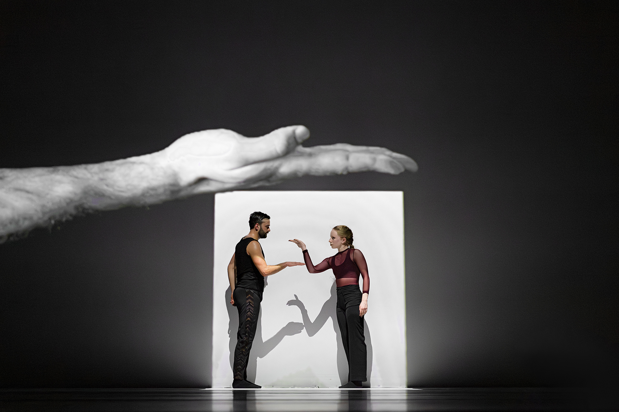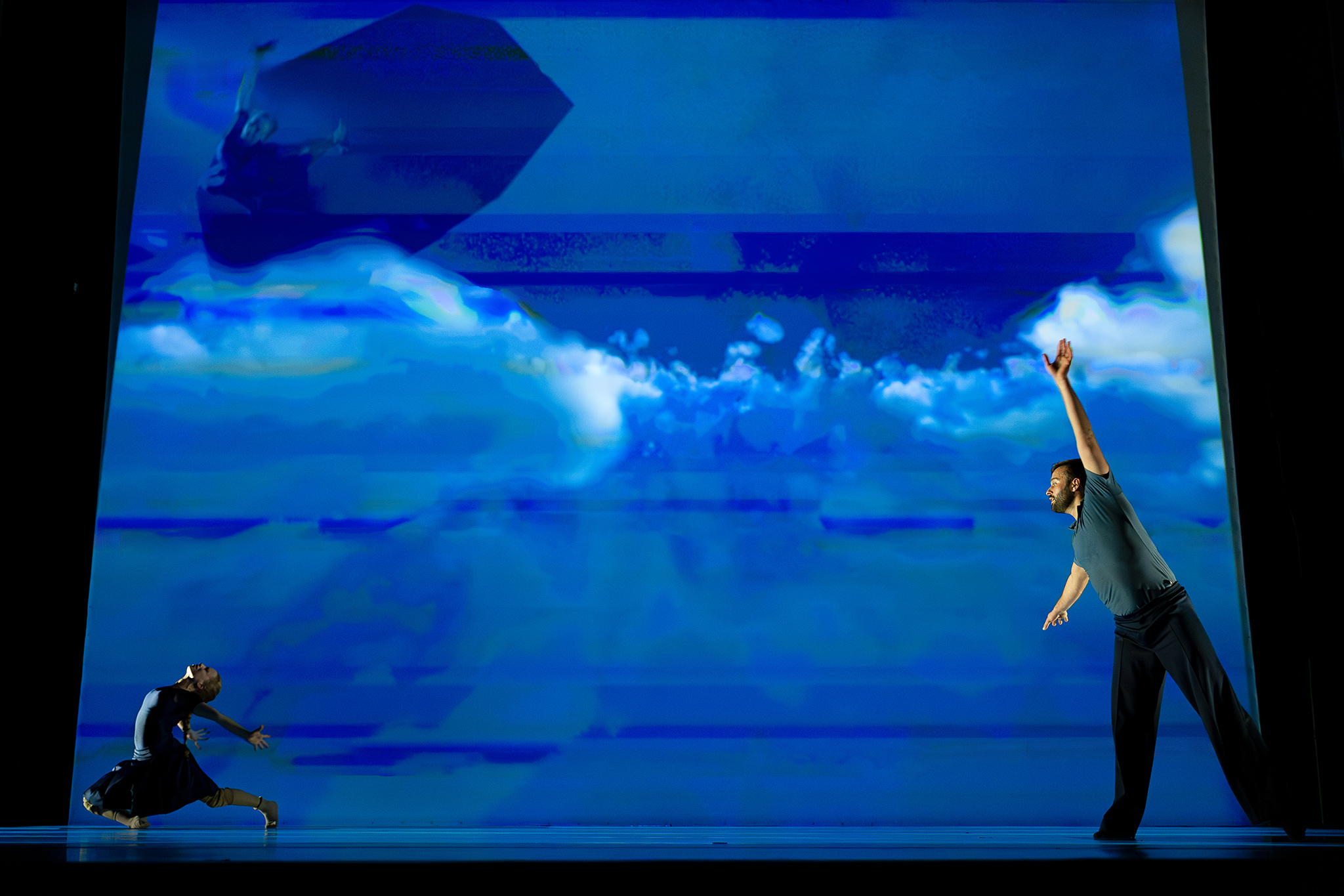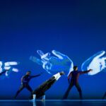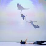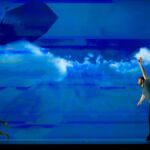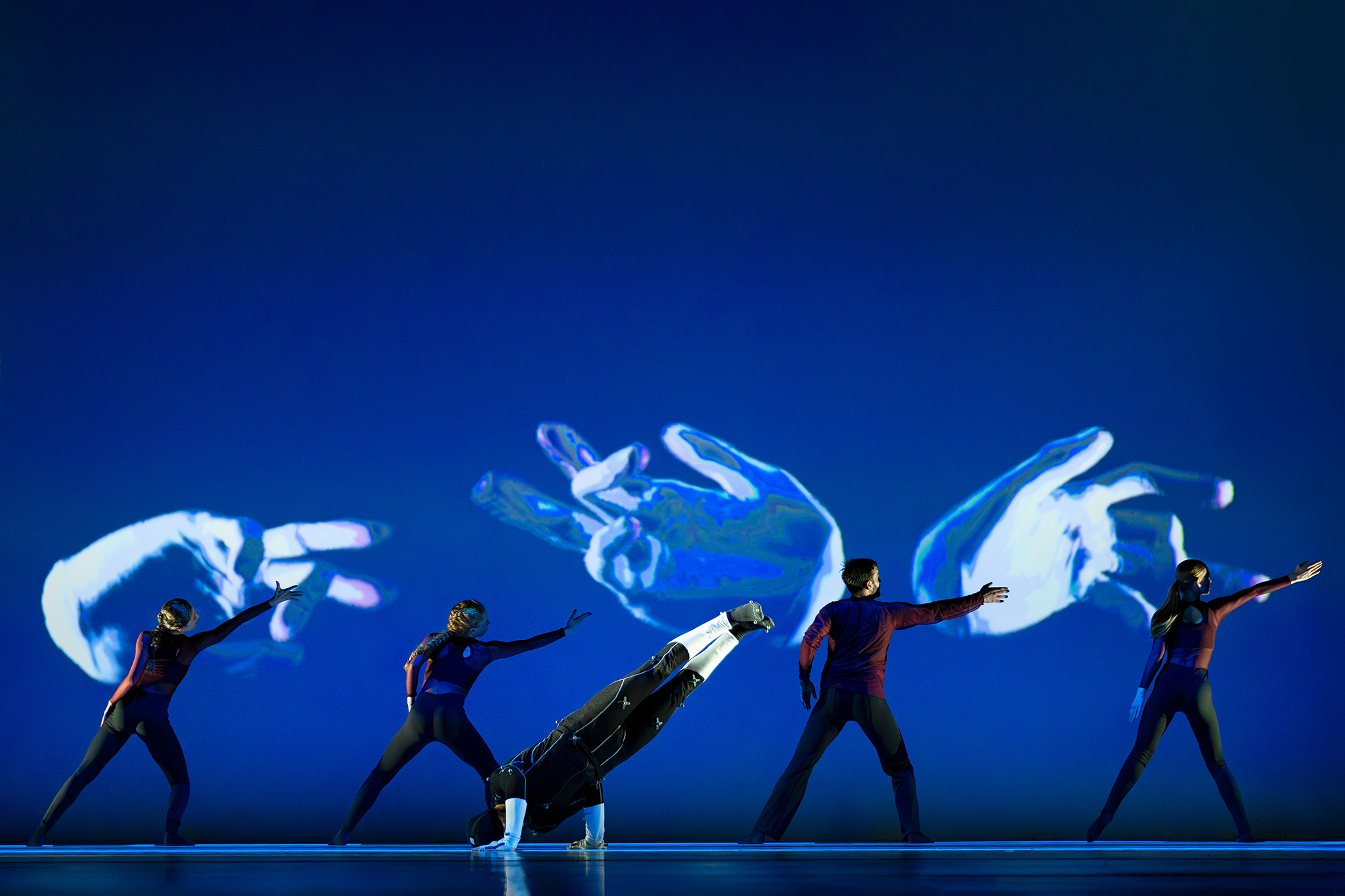 Zoals altijd bij Another Kind of Blue speelt technologie een belangrijke rol, maar hier is ze subtieler aanwezig — als verlengstuk van het lichaam. Virtuele handen bewegen mee via motion capture, terwijl in het werk Arms drones samen een bovenlijf vormen dat reageert op improviserende dansers. Zo ontstaat een directe dialoog tussen mens en machine, waarin technologie niet alleen ondersteunt, maar zelf lijkt mee te voelen. En in Flyland (2016) lijken dansers door de lucht te vallen, gevangen en voortgestuwd door hun eigen schaduwen. Licht en projectie worden hier een danspartner die de wetten van de zwaartekracht opheft en de grenzen van het lichaam vervaagt.