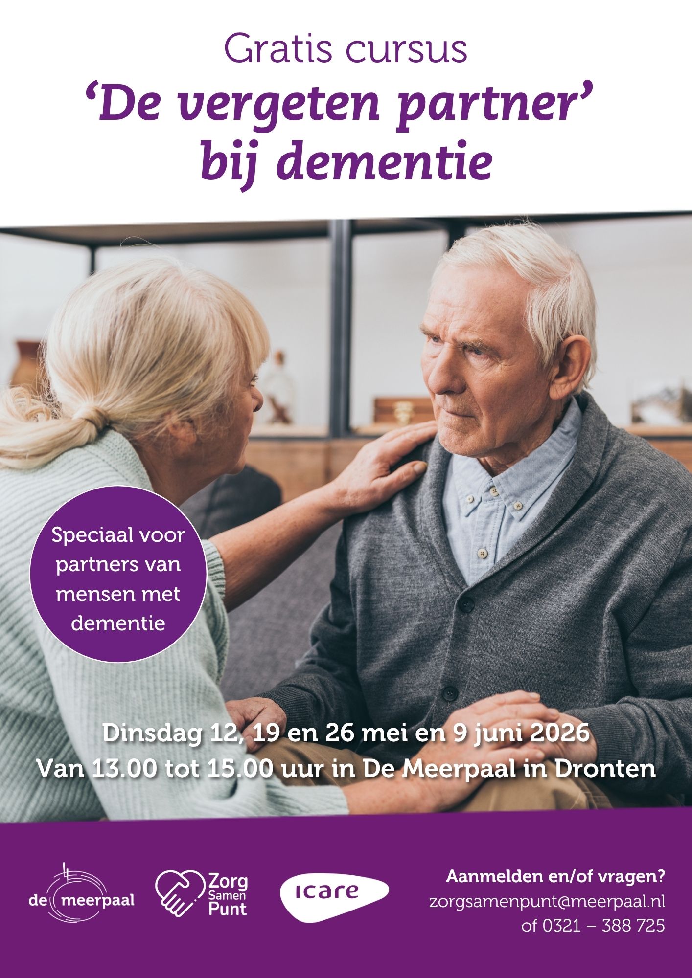 Zorgen voor een partner met dementie kan intens zijn en veel van je vragen. Daarom start op dinsdag 12 mei 2026 in De Meerpaal de cursus ‘De vergeten partner’.