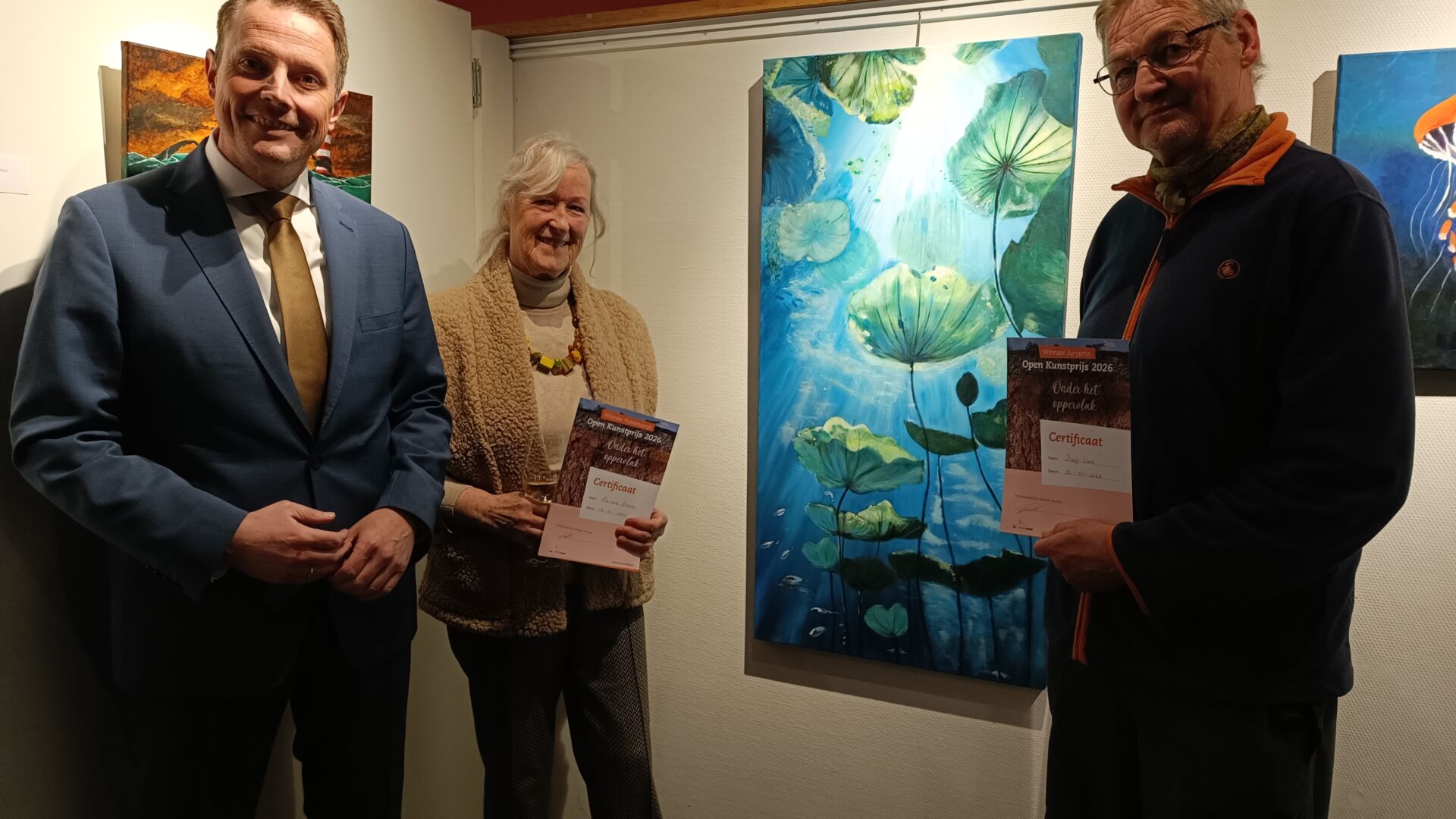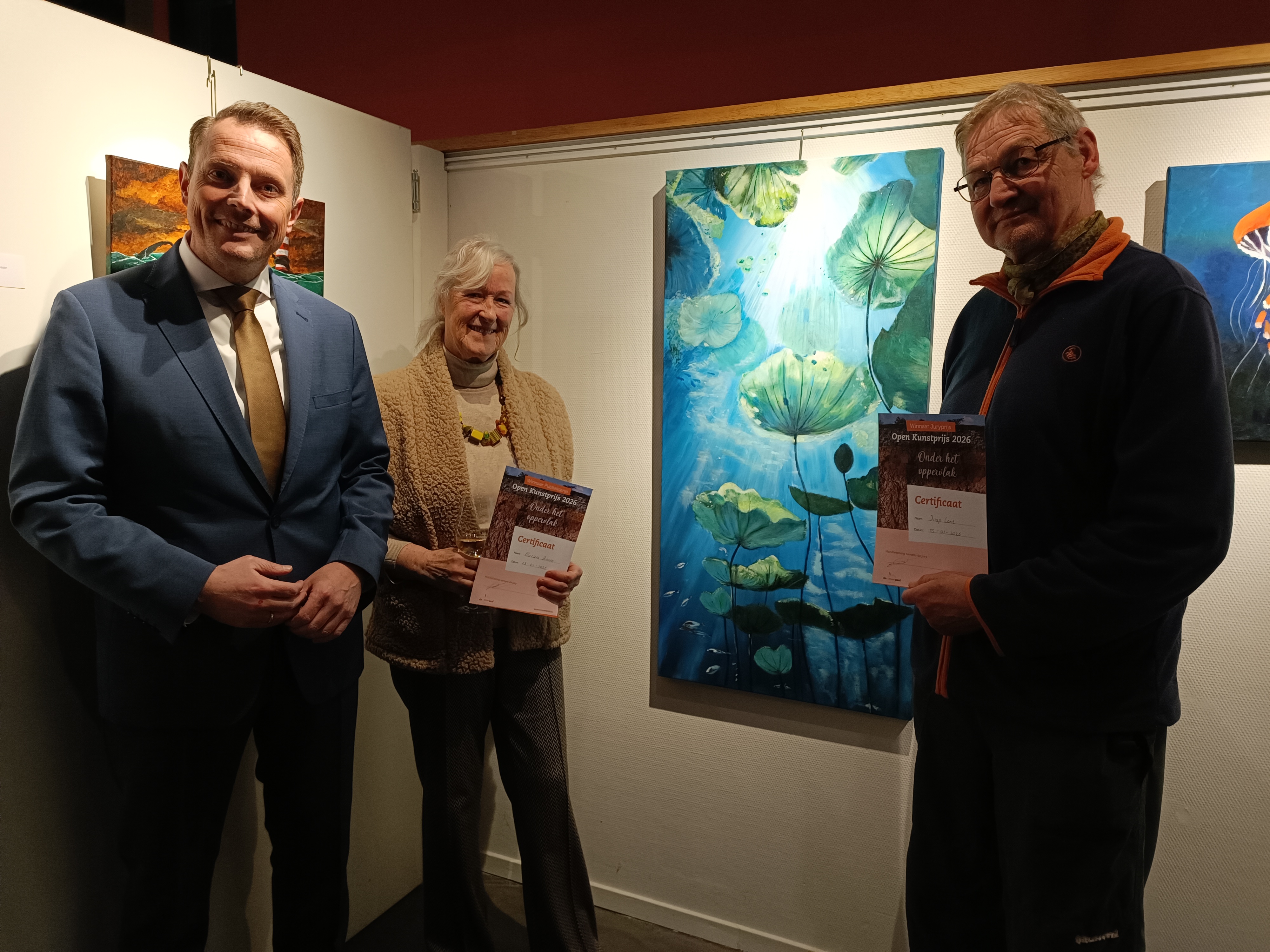 In De Meerpaal zijn afgelopen vrijdag 23 januari de winnaars bekendgemaakt van de ‘Open Kunstprijs Dronten’. Uit handen van wethouder Siert-Jan Lap ontving Jaap Lont de juryprijs. Marlene Boons wist voor het tweede jaar op rij de harten van de inwoners te veroveren en nam de publieksprijs in ontvangst.