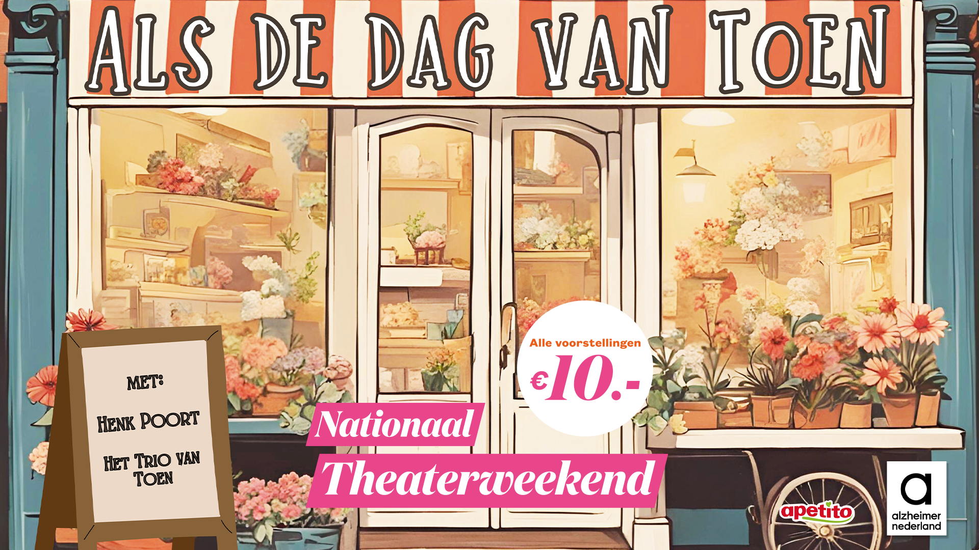 Op 23, 24 en 25 januari 2026 ademt heel Nederland theater tijdens het Nationaal Theaterweekend. Samen met meer dan 80 theaters openen we onze deuren en kun je voor slechts 10 euro een voorstelling bezoeken! Laat je verrassen en ontdek onbekende parels: van meeslepende jaren ’80 livemuziek en spectaculaire illusies tot ontroerend toneel en nostalgische musicalmomenten.