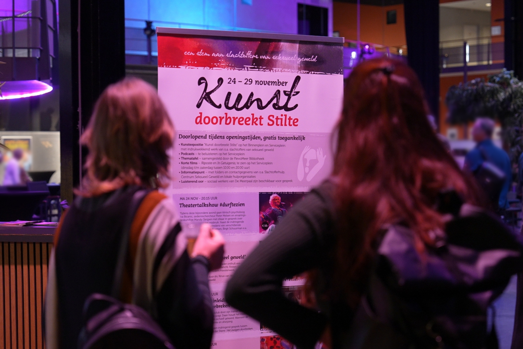 Van 24 t/m 29 november organiseerden wij de themaweek ‘Kunst doorbreekt Stilte’. Een week die raakte, samenbracht en liet zien hoe kunst kan helpen om stilte rondom seksueel geweld te doorbreken met ruimte voor beeld, verhaal en ontmoeting.